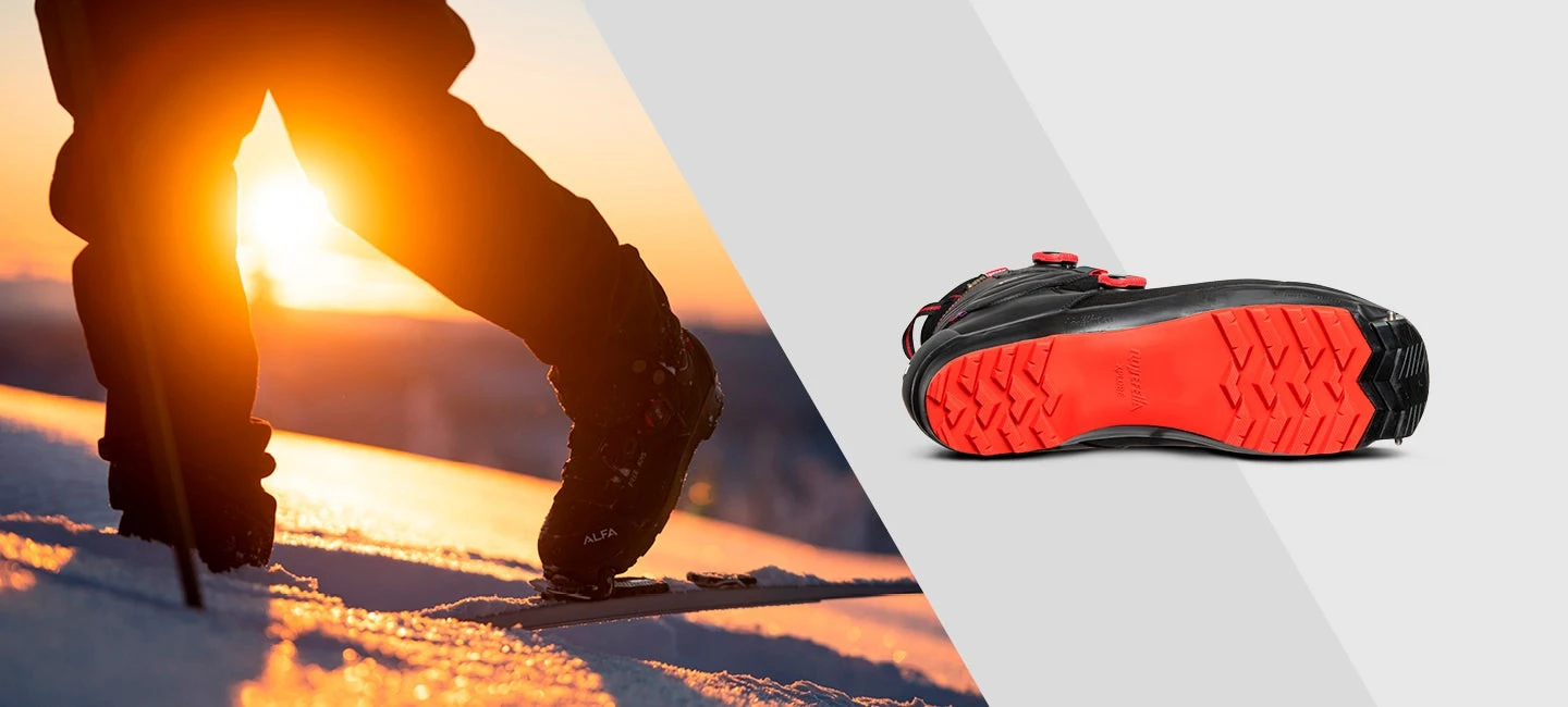 La semelle Xplore est conçue pour être suffisamment flexible verticalement tout en étant plus rigide horizontalement afin de limiter les torsions latérales. Le dispositif d’attache avant SpringSpin permet d’enclencher très facilement la chaussure dans la fixation et le retrait est aussi très aisé. Il s’agit de deux pointes à ressort qui viennent s’enfoncer sur la griffe avant de la fixation. Le positionnement des pointes offre le meilleur débattement possible et un contrôle optimal des skis.