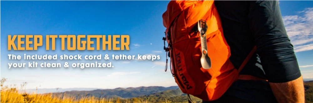 Deux trous situĂ©s sur le manche de la Titanium Utility Spork, permettent de la fixer sur le cordon fournit Ă cet effet. Ceci permet de lâaccrocher pour la faire sĂ©cher ou de la transporter sans risque de perte.