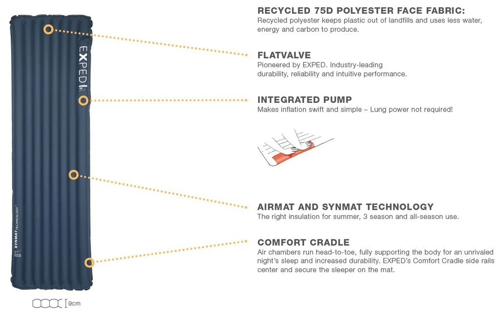 - Léger et robuste : les matériaux utilisés (polyester 75 deniers recylcé) permet à Exped de proposer un matelas avec un bon rapport poids/robustesse.