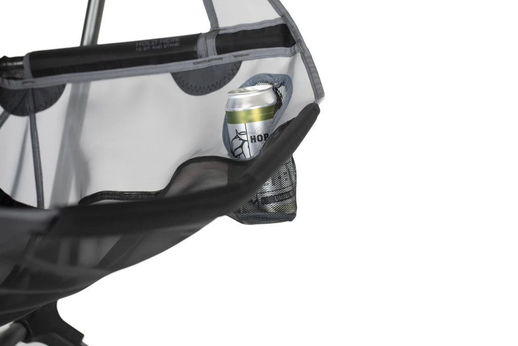 Chaise de camping pliable, confortable et inclinable, avec appuie-tête et porte-gobelet.