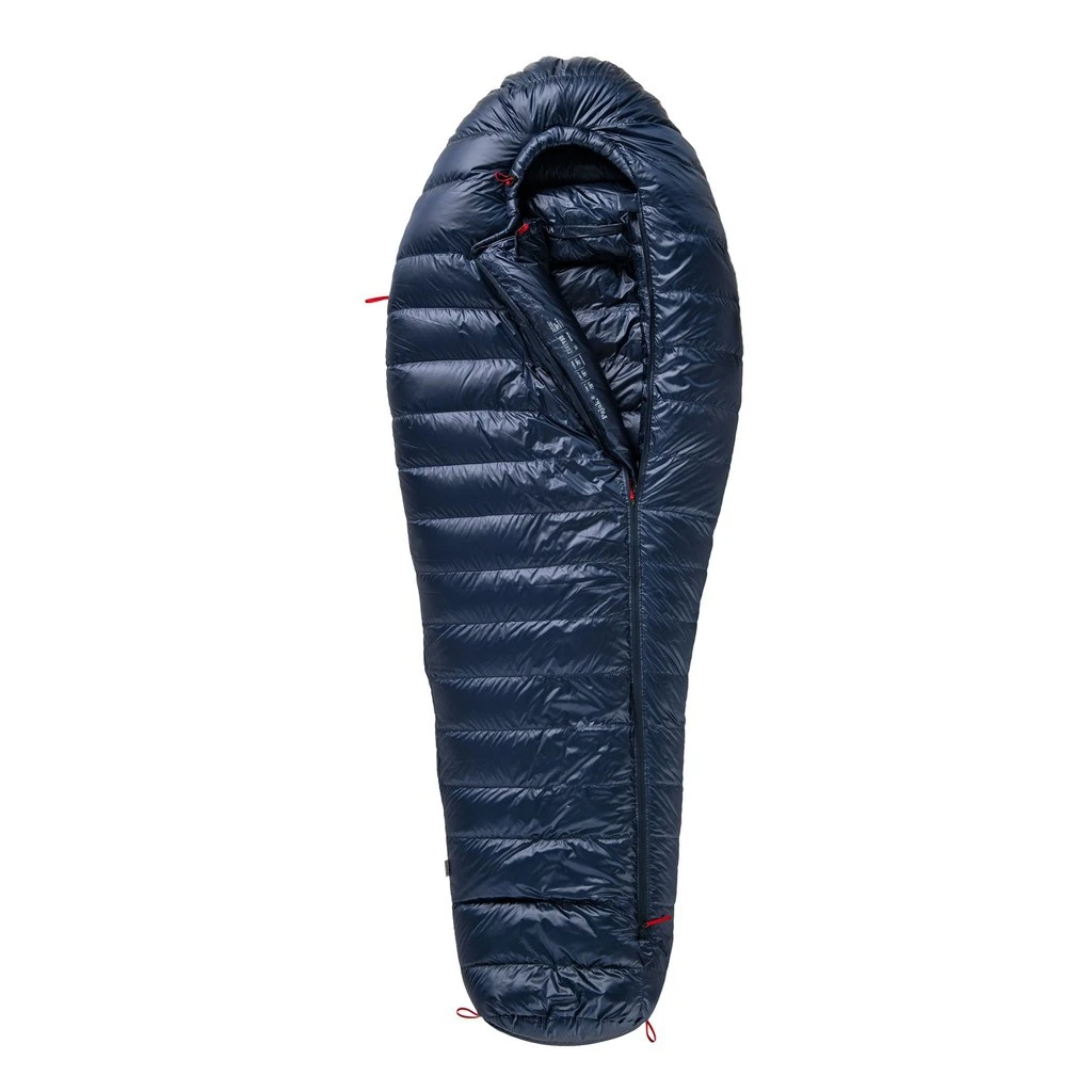 L’enveloppe est réalisée avec un tissu ultraléger et respirant, du Toray Airtastic SLF15 DWR, formant un cloisonnement en Z. Les parois inclinées entre les chambres permettent une meilleure isolation par rapport une construction en H classique. La fermeture éclair YKK est très fluide et elle ne se coince pas au contact du l’enveloppe du sac de couchage.