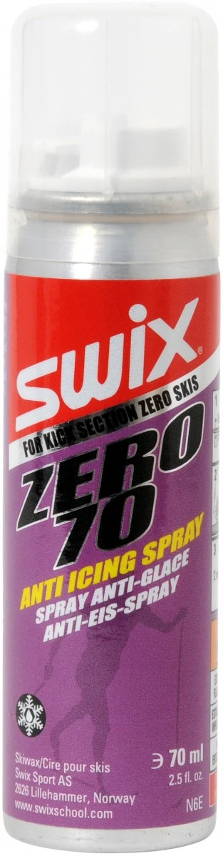 Le Zero 70 de Swix est un spray qui empĂȘche la formation de givre ou de glace sous les patins ou la zone des Ă©cailles.