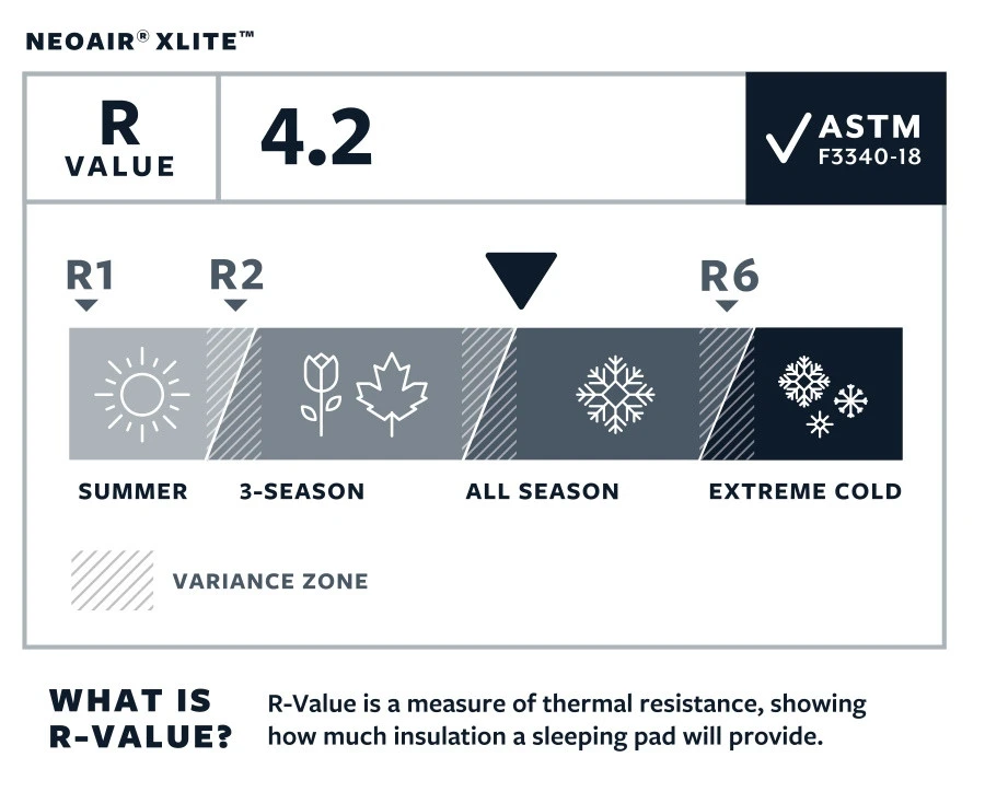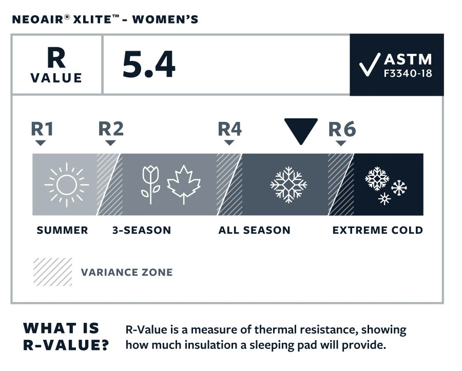 Le NeoAir XLite est un tapis de sol 4 saisons avec une isolation performante obtenue grâce à l’utilisation de barrières réfléchissantes à l’intérieur du matelas. Ces feuilles d’aluminium permettent une convection de la chaleur. La chaleur est emprisonnée dans les boudins et est réfléchie vers votre corps ! Ce procédé permet de stopper le froid venant du sol. En taille 119, 183 et 196 cm le matelas a une résistance thermique R-Value de 4.2, calculée avec la nouvelle norme ASTM F3340-18. Le modèle femme de 168 cm est doté d’une isolation plus importante et dispose d’un R-Value de 5.4, ce qui en fait un matelas 4 saisons. Pour cela, il est composé de deux feuilles d’aluminium réfléchissantes (au lieu d’une) et de tois niveaux de chambre à air dans les boudins.